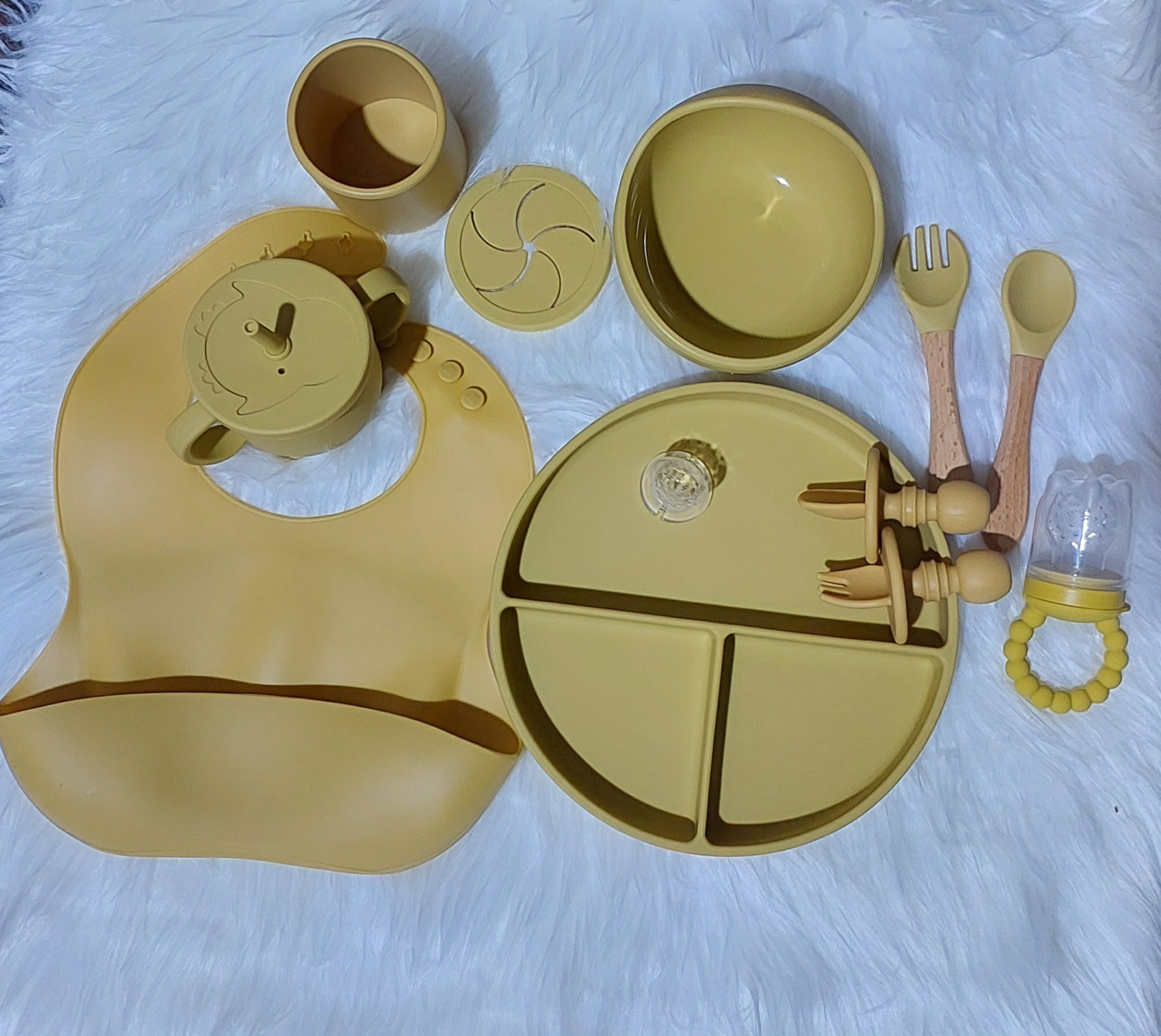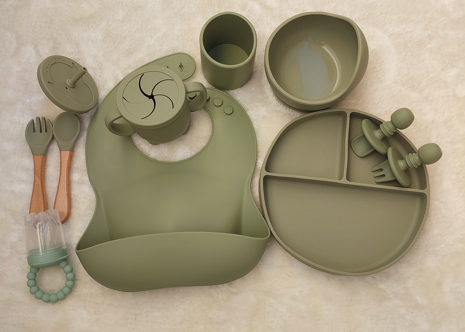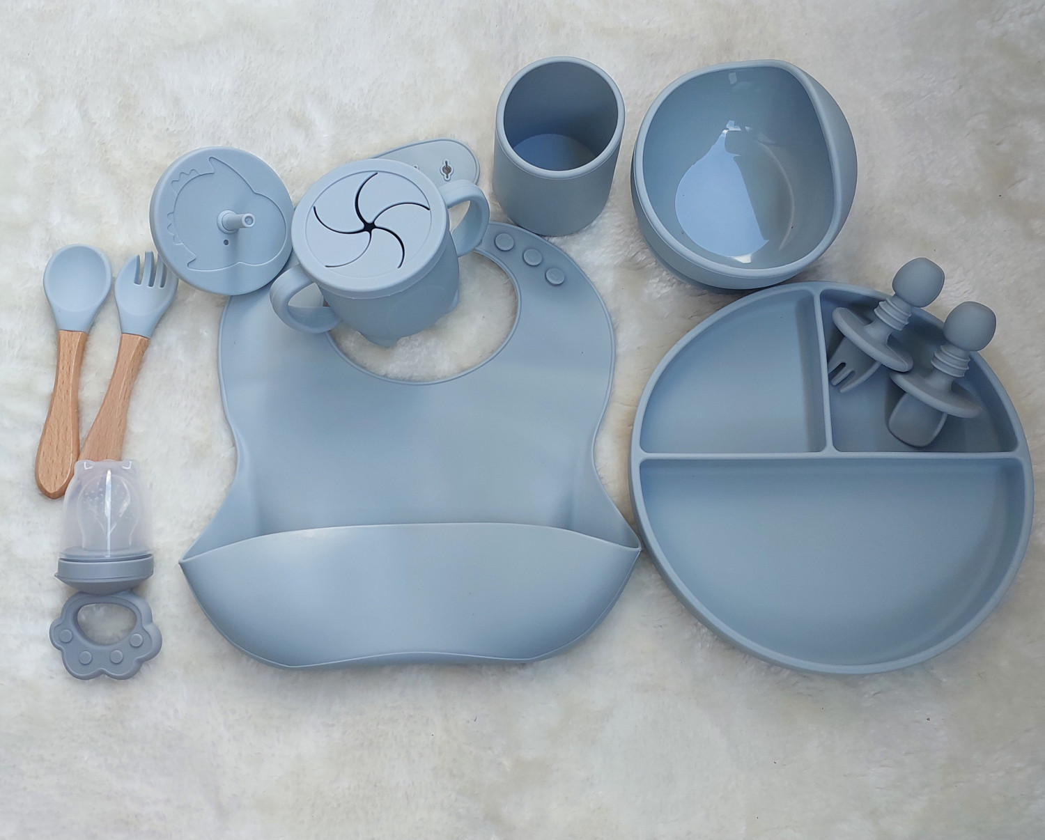 Ensemble d'alimentation en silicone pour bébé, lot de 12 pcs ( 1 assiette, 1 bol, 2 couvercles, 1 gobelet, 1 bavoir, 1 verre, 2 fourchettes, 2 cuillères, 1 tétine à fruits)